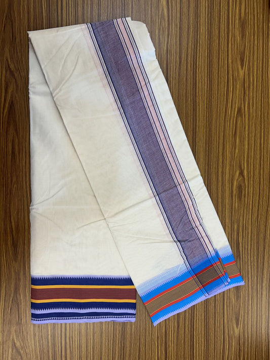 20% Discount ! Kaitharikada Balaramapuram 100% Cotton Pure White Double Mundu/Dothi - 100x80 - 1.5 inch Navy Blue & Multi Colour Stripes Design Kara 3.80 mtr (8 muzham) - 13 KK5323 THI