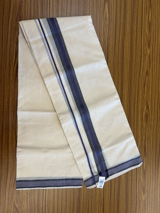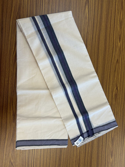Kerala Handloom - Signature Kaitharikada - Government Sealed Hallmarked-100% Pure Cotton! (2/120sX100) Twisted Thread- Off White Double Mundu/Dhoti - 1.25 inch Lavender Blue Shaded Striped Kara 4 mtr (8.5 muzham) - 22 KK5331 KAL