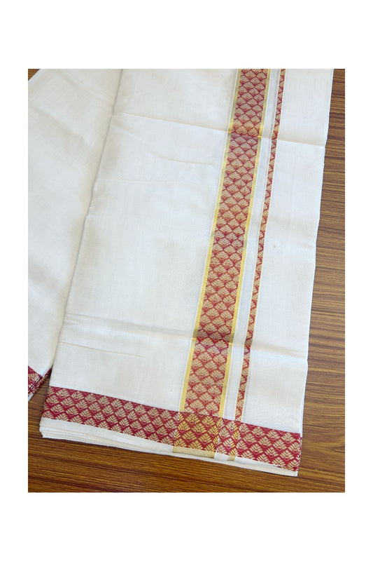 15% Discount!!! KaithariKada HANDLOOM UNAKKUPAAV Balaramapuram - 100% PURE Cotton off white (Unbleached) Double Mundu/Dhoti - 3 inch Kasavu & Maroon triangle pattern kara - 5KK415SOM