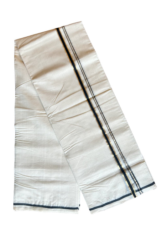 18% Discount! KaithariKada Balaramapuram 100% Cotton Off white Double Mundu/Dhoti - (100x80)s - 1.5 inch Puliyilakkara Black Stripes Chutty Gold Kasav - 147 KK5258 THI