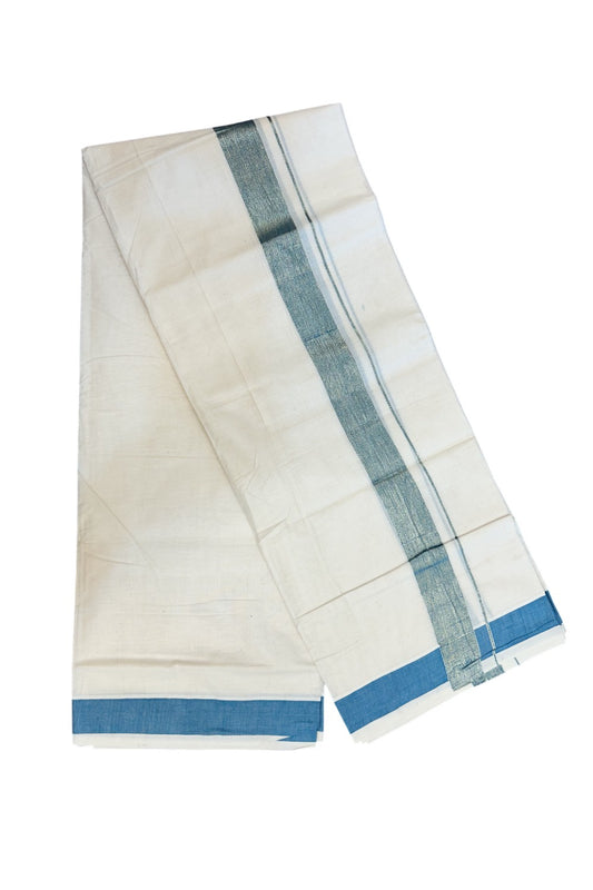 20% DISCOUNT ! KaithariKada Balaramapuram Mixed Cotton OFF WHITE (Unbleached) Double Mundu/Dhoti - 60s Thread Mixed Cotton - 1.5 inch Peacock Blue & Gold Kasav Kara - 8KK5213 VIN