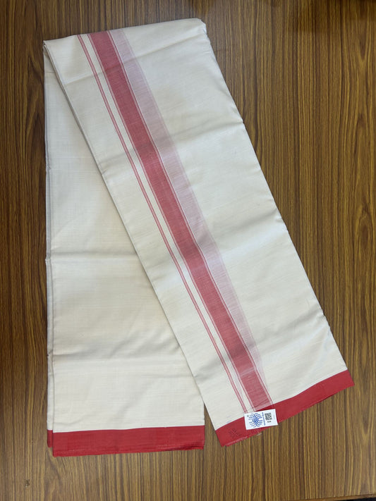 Kerala Handloom - Signature Kaitharikada - Government Sealed Hallmarked-100% Pure Cotton! (2/120X2/160) Twisted Thread- Off White Double Mundu/Dhoti - 1.25 inch Red Shaded Striped Kara 4 mtr (8.5 muzham) - 3 KK5333 KAL