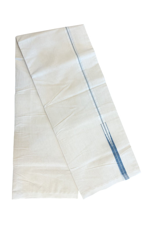 Kerala Handloom - Signature Kaitharikada - 25% Discount! - Government Sealed Hallmarked-100% Pure Cotton! (90x80) Twisted Thread- Off White Double Mundu/Dhoti - 1.5 inch Silver Kasav & Peacock Blue Kara 4 mtr (8.5 muzham) - 4 KK5331 KAL
