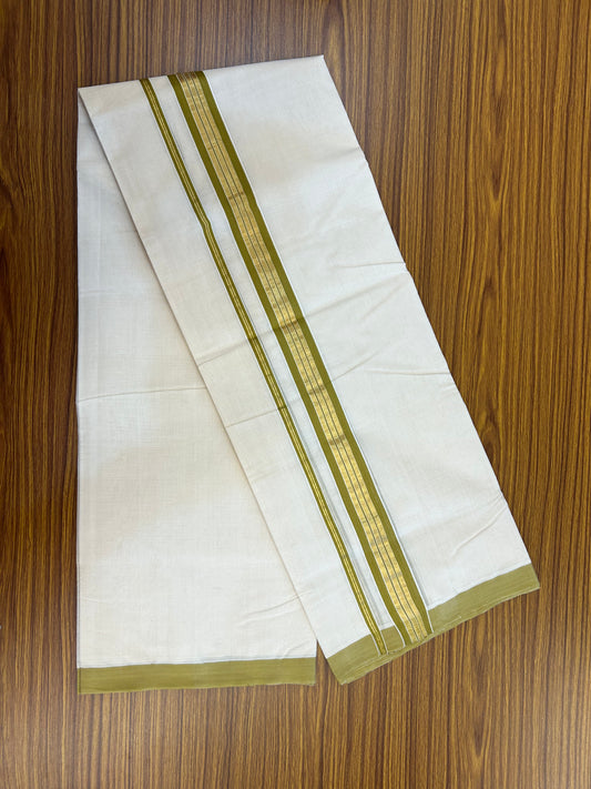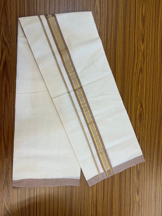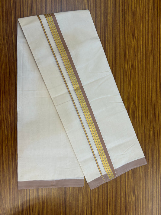 25% Discount ! KaithariKada Handloom Millpaav Balaramapuram - 100% Pure Cotton Off White (Unbleached) Double Mundu/Dothi - 80x90 - 1.5 inch Gold Kasav & Olive Brown Striped Kara 4 Mtr (8.5 Muzham) - 23 KK5328 RAM