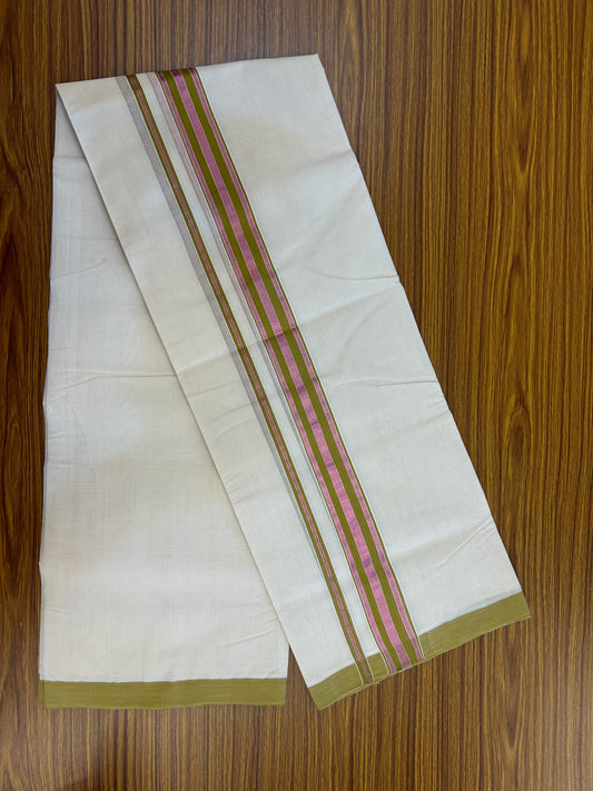 25% Discount ! KaithariKada Handloom Millpaav Balaramapuram - 100% Pure Cotton Off White (Unbleached) Double Mundu/Dothi - 80x90 - 1.5 inch Rose Pink Kasav & Olive Brown Striped Kara 4 Meters (8.5 Muzham) - 6 KK5328 RAM