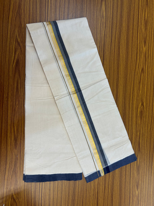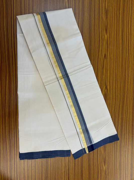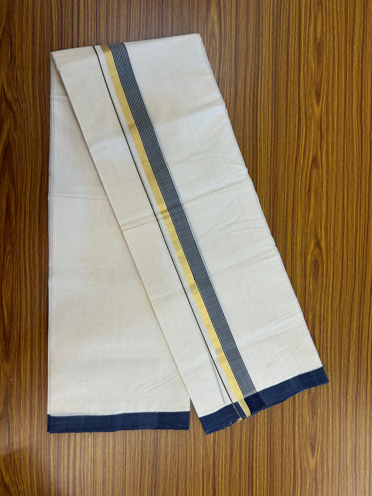 25% Discount ! KaithariKada Handloom Millpaav Balaramapuram - 100% Pure Cotton Off White (Unbleached) Double Mundu/Dothi - 80x90 - 1.5 inch Gold Kasav & Navy Blue Shaded Striped Kara 3.60 Mtr (8 Muzham) - 17 KK5328 RAM