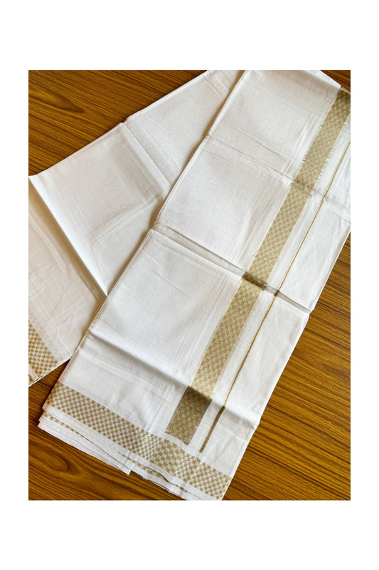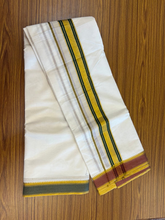 20% Discount! KaithariKada Cotton Mix Off White - (Unbleached) 80X90 thread - North Indian - Attached Gamcha - 10X6 Dhoti -0.25 inch Gold Kasav kara with Maroon & Green Gold Kasav Design border - 15 KK8304 PMC