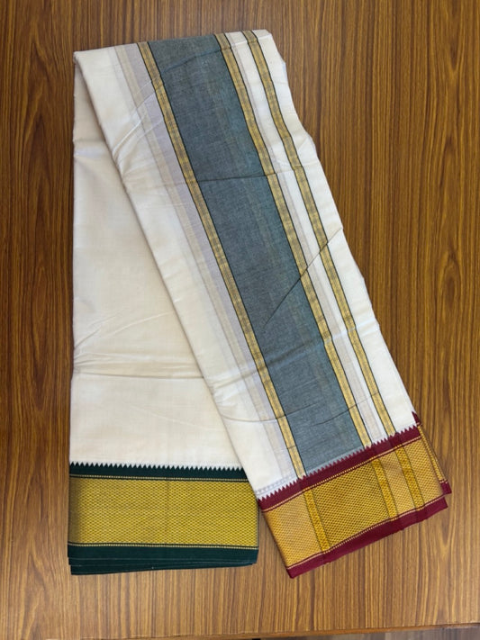 20% Discount! KaithariKada Cotton Mix Off White - (Unbleached) 80X90 thread - North Indian - Attached Gamcha - 10X6 Dhoti - 3.75 inch Green Gold Kasav kara with Dark Maroon & Green Gold Kasav Design border - 4 KK8304 PMC