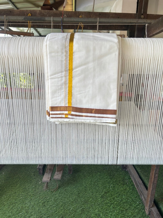 20% Discount! KaithariKada Cotton Mix Off White - (Unbleached) 80X90 thread - North Indian- Attached Gamcha - 10X6 Dhoti - 1 inch Gold Kasav kara with Maroon & Green Gold Kasav Design border - 18 KK8304 PMC