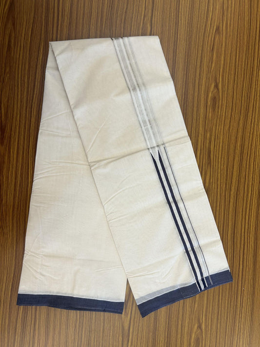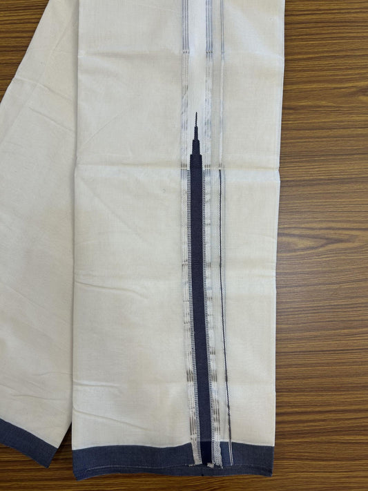 20% Discount !! KaithariKada Balaramapuram 100% Cotton Double Off White - (Unbleached) Mundu/Dhoti - 100x100 1.25 inch Heavy Chutty Silver Kasav & Navy Blue Striped kara - 3 KK5348 ASH