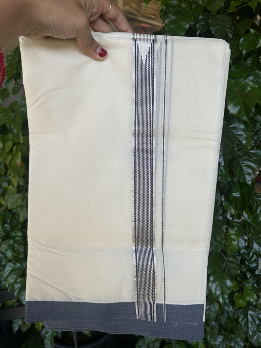 20% Discount !! KaithariKada Balaramapuram 100% Cotton Double Off White - (Unbleached) Mundu/Dhoti - 100x100 1.25 inch Heavy Chutty Silver Kasav & Navy Blue Striped kara - 2 KK5348 ASH