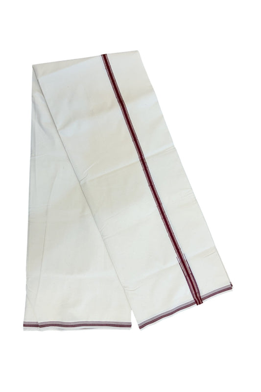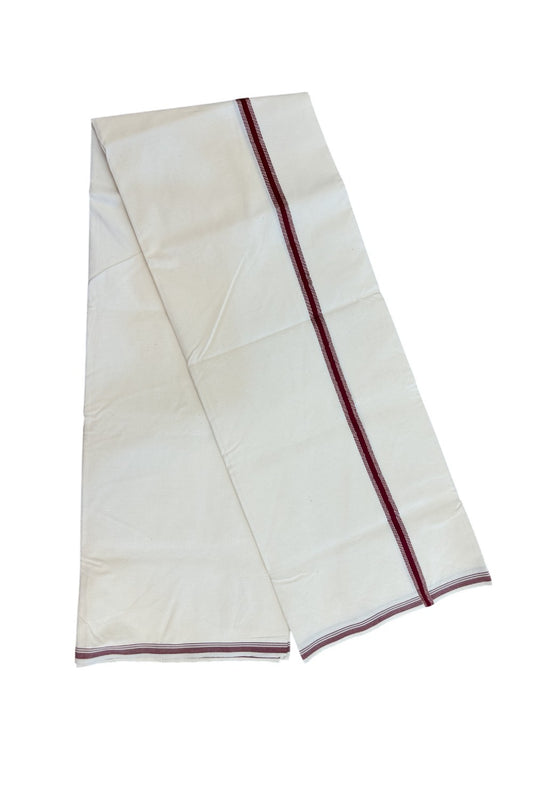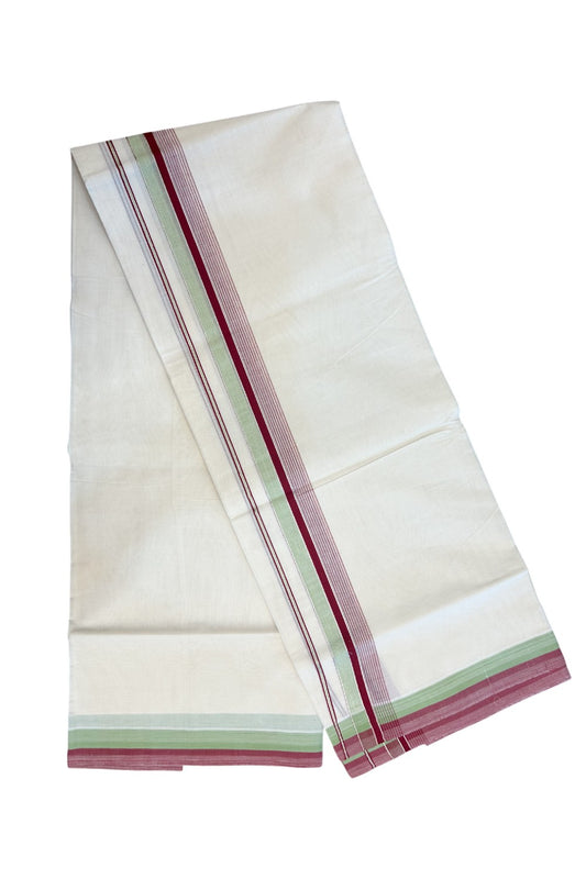 20% Discount! KaithariKada Balaramapuram 100% Cotton Double Off White (unbleached) Mundu/Dhoti- 100x80- 1.5 inch Silver Kasav Maroon Red & Pistha Green Stripes Shaded Kara 4 mtr (8.5 muzham) - 99KK5227 PMC