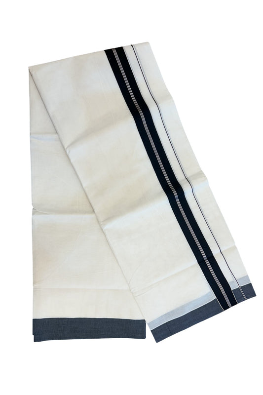 20% Discount! KaithariKada Balaramapuram 100% Cotton Double Off White (unbleached) Mundu/Dhoti- 100x80- 1.5 inch Silver Kasav & Black Stripes Shaded Kara 4 mtr (8.5 muzham) - 100KK5227 PMC