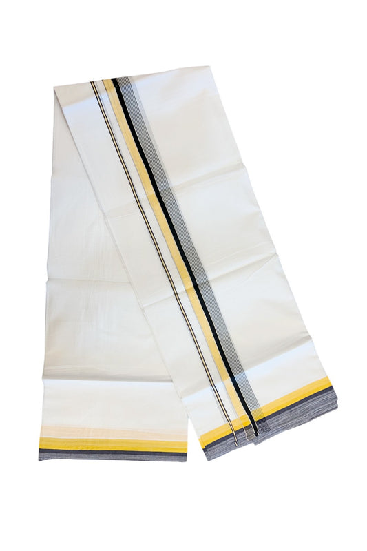 20% Discount! KaithariKada Balaramapuram 100% Cotton Double Pure white Mundu/Dhoti- 100x80 - 1.5 inch Silver Kasav Navy Blue & Orange Yellow Shaded Striped Kara - 3.86mtr ( 8 muzham) - 33KK5227 PMC