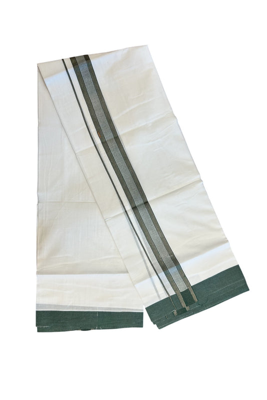 17% Discount! KaithariKada Balaramapuram 100% Cotton Double Pure White Mundu/Dhoti - 100x100 - 1.5 inch Sage Green Silver Kasav & Gold Kasav Stripes Kara - 9KK5221 GAN