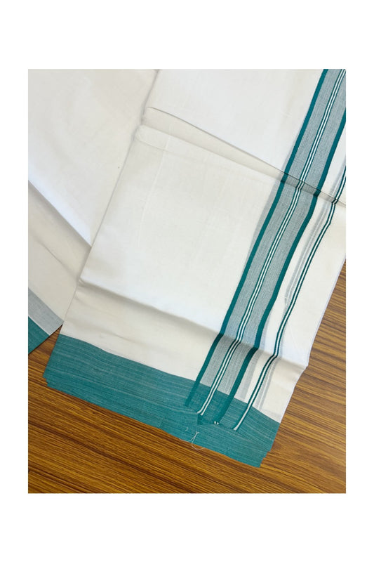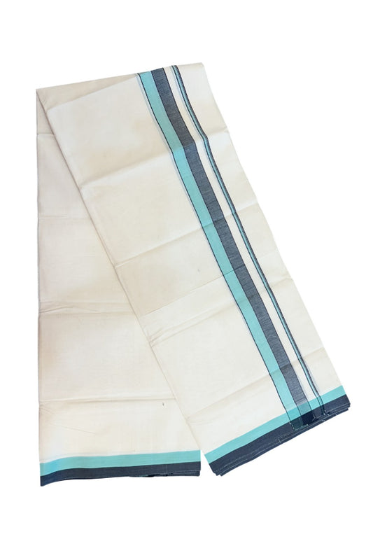 20% Discount! KaithariKada Balaramapuram 100% Cotton Off White Double (Unbleached) Mundu/Dhoti-100x80 - 1.5 inch Turquoise Green & Black shaded designer kara 4 mtr (8.5 muzham) - 120KK5220 THI