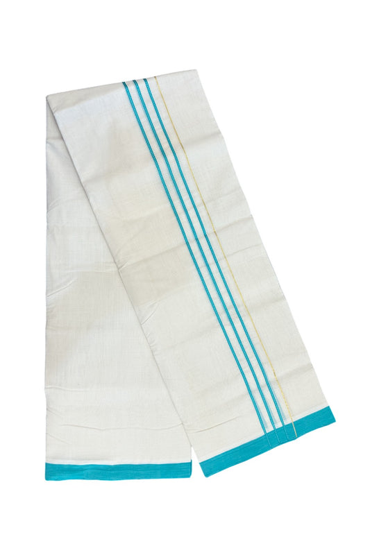 25% Discount!! KaithariKada Handloom Unakkupaav Balaramapuram - 100% Pure Cotton Off White - (Unbleached) Double Mundu/Dothi - 80x100 - 1.5 inch Turquoise blue stripes pattern kara 3.80 meter (8.5 Muzham) - 28KK5209 REA