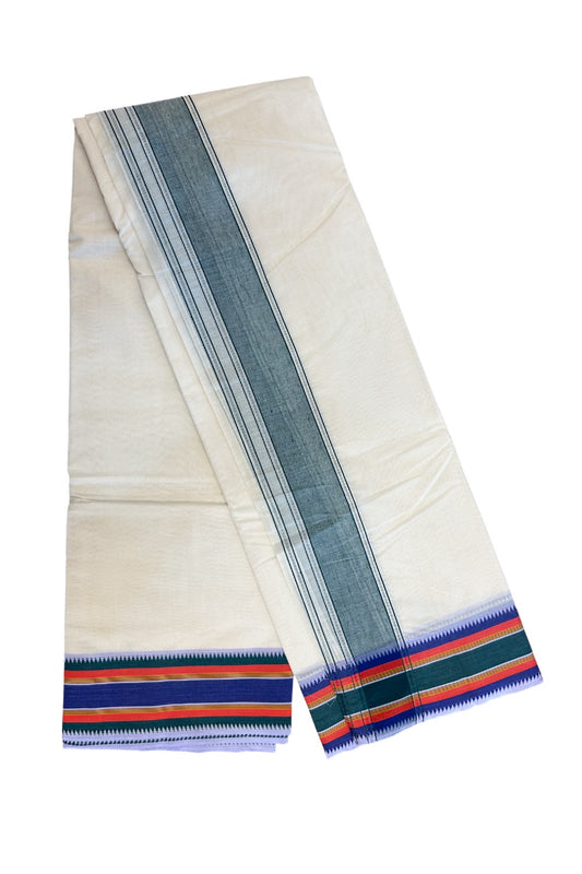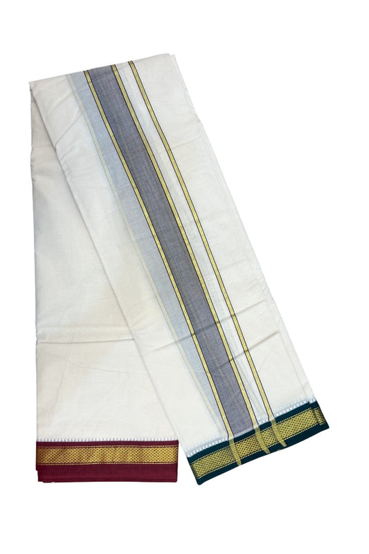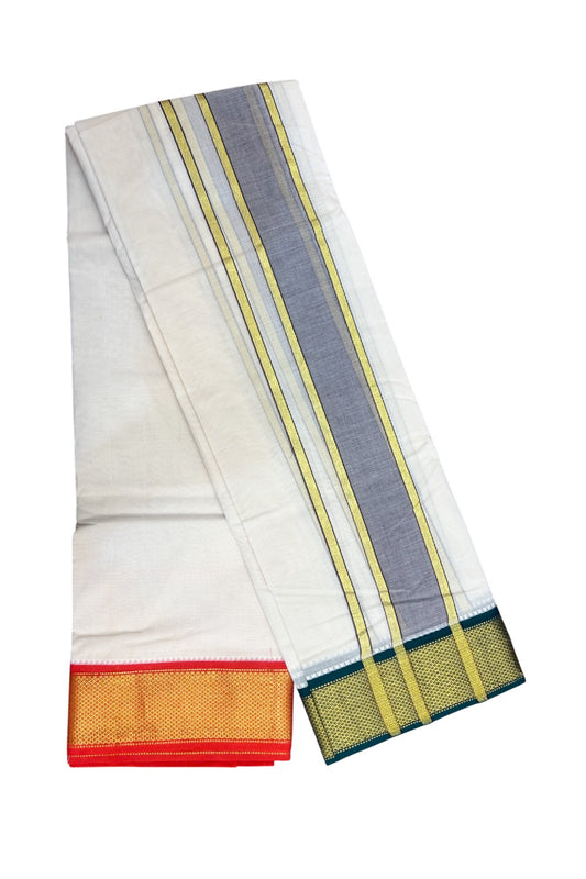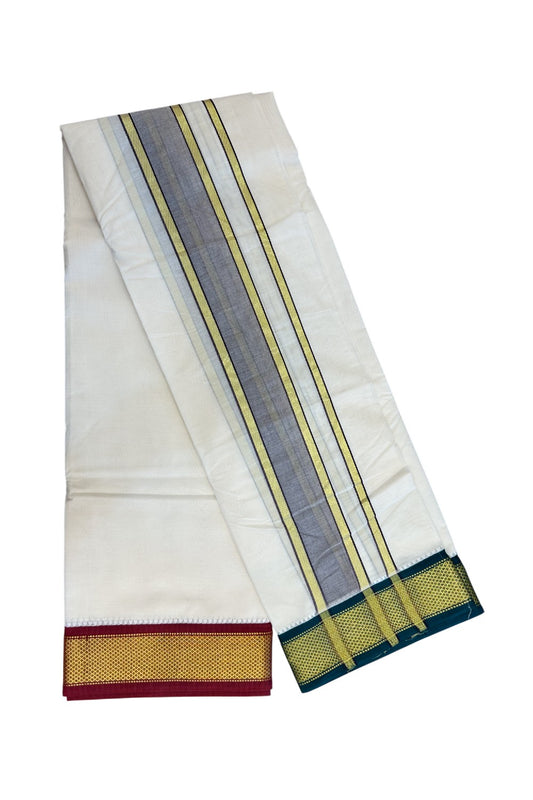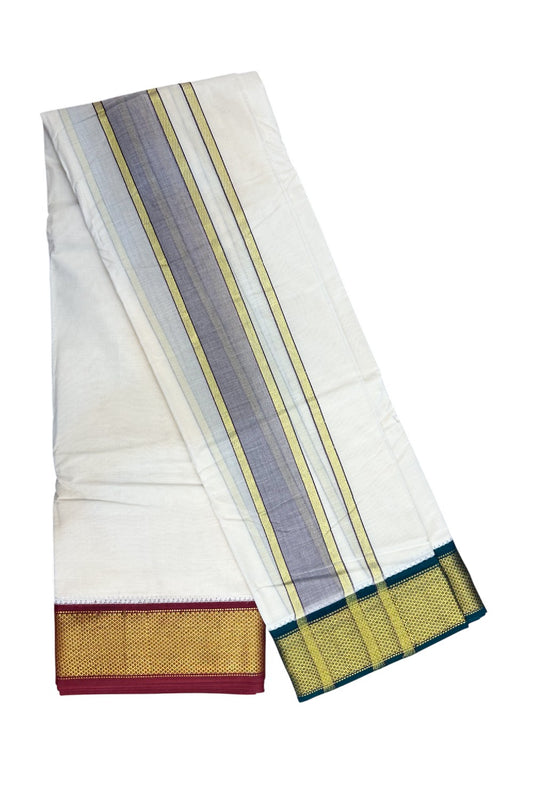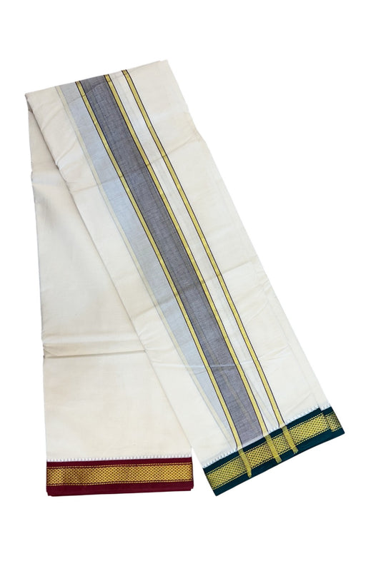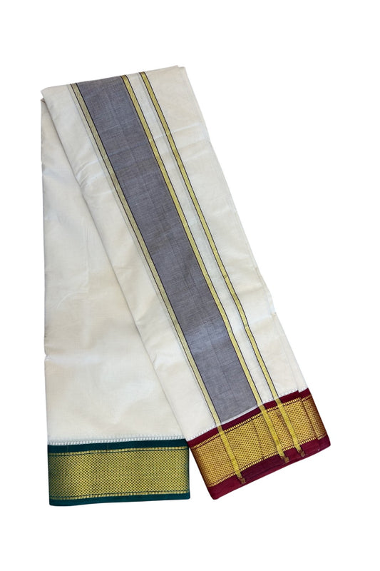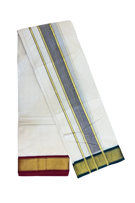 Panchakacham Dhoti - 20% Discount! KaithariKada 100% Cotton Off White (Unbleached) - Pure Cotton - 100x100 thread - North Indian - Attached Gamcha 9X5 Dhoti Dark green kara with Violet Green & Red Brown Striped border - 31KK5196PMC
