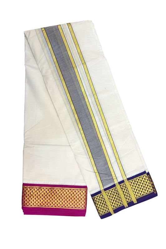Panchakacham Dhoti - 20% DISCOUNT! KaithariKada 100% Cotton Off White - (Unbleached) 100x100 thread - NORTH INDIAN- ATTACHED GAMCHA 10x6 Dhoti 2.25 inch Violet kara with Maroon & Dark Green Kasavu border - 29KK5196PMC