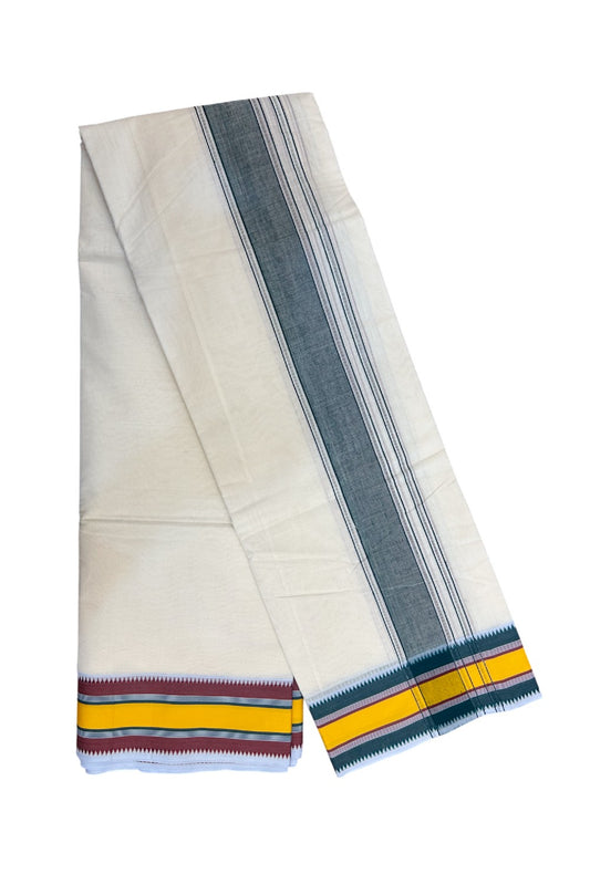 Panchakacham Dhoti - 20% DISCOUNT! KaithariKada 100% Cotton Off White - (Unbleached) - Pure Cotton -100x100 thread - NORTH INDIAN - ATTACHED GAMCHA 9X5 Dhoti Dark green kara with Yellow Green & Brown Striped border - 23KK5196PMC