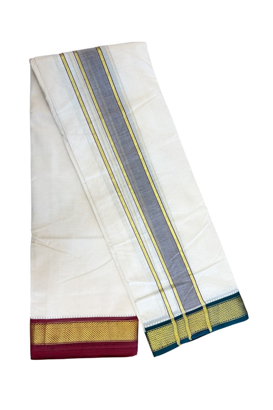 Panchakacham Dhoti - 20% DISCOUNT! KaithariKada 100% Cotton Off White - (Unbleached) 100x100 thread - NORTH INDIAN- ATTACHED GAMCHA 9x5 Dhoti 2 inch Violet kara with Maroon & Dark Green Kasavu border - 30KK5196PMC
