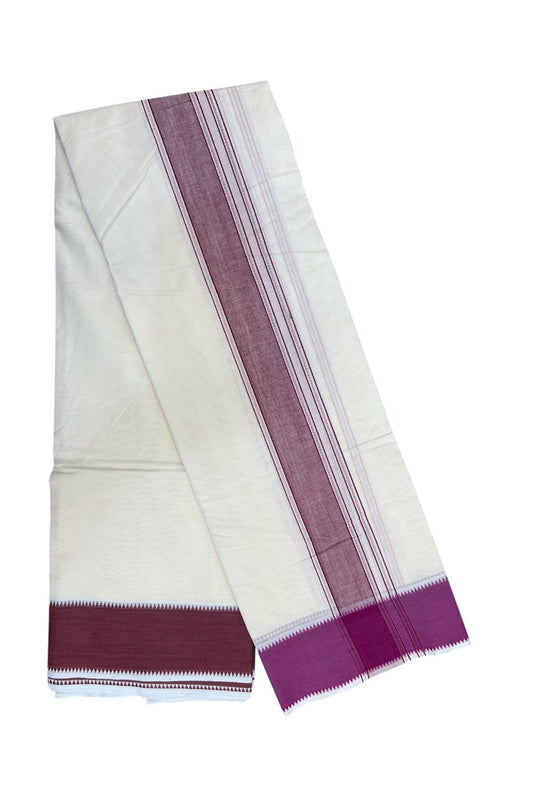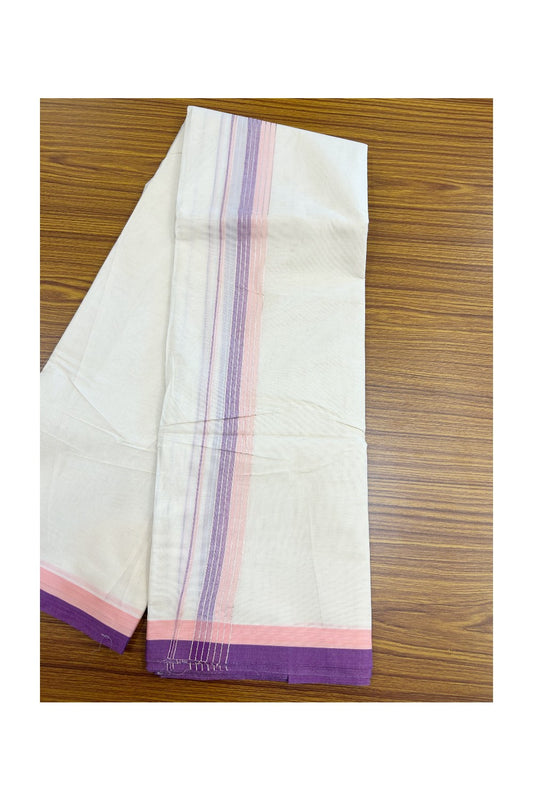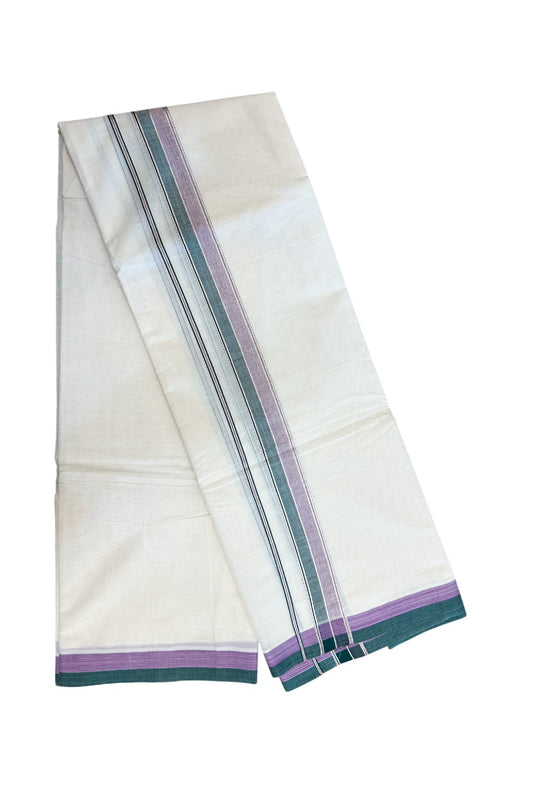 Panchakacham Dhoti - 20% DISCOUNT! KaithariKada 100% Cotton Off White - (Unbleached) 100x100 thread - NORTH INDIAN ATTACHED GAMCHA 9X5 Dhoti - 2 inch Violet kara with Maroon & Green Kasavu border - 16KK5196PMC