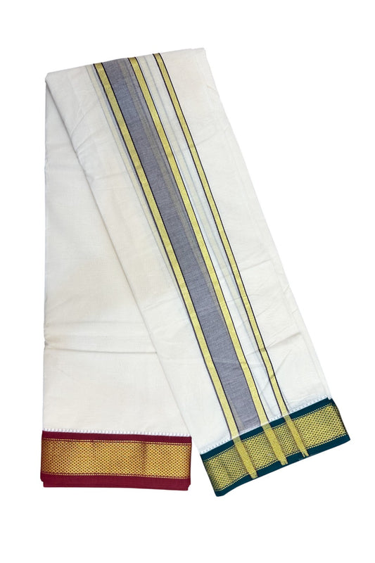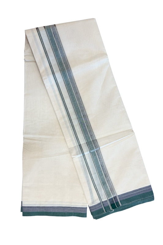 Panchakacham Dhoti - 20% DISCOUNT! KaithariKada Cotton OFF White - 100x80 thread- NORTH INDIAN ATTACHED GAMCHA - 9X5 Dhoti - 1.5 inch Silver Kasavu Dark Green & Shaded Violet Stripes Kara - 4KK5189PMC