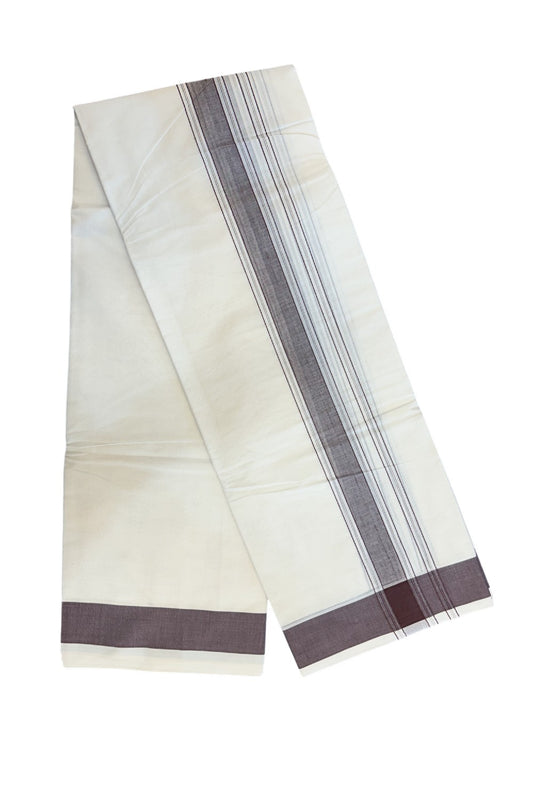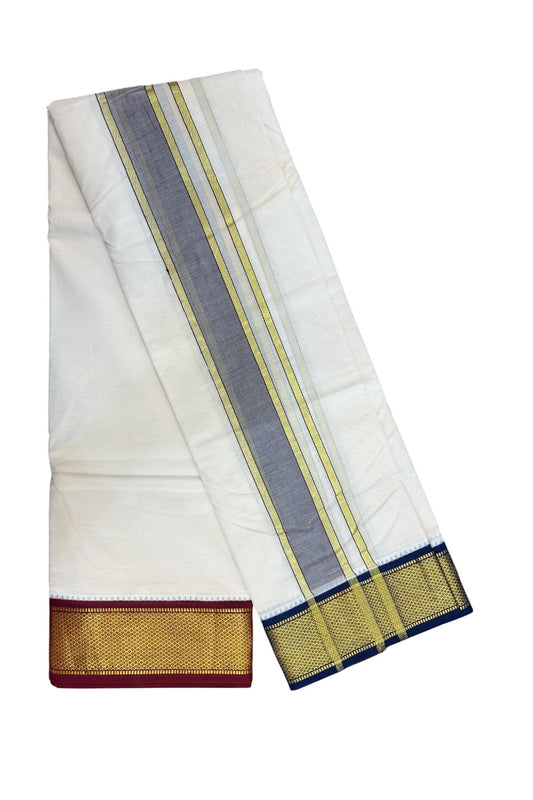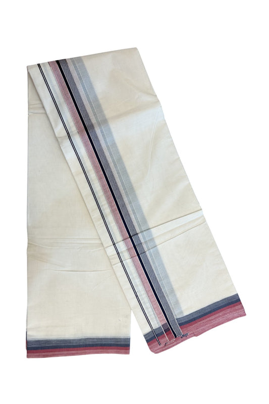 Panchakacham Dhoti - 20% DISCOUNT! KaithariKada 100% Cotton Off White - (Unbleached) 100x100 thread - NORTH INDIAN- ATTACHED GAMCHA 9X5 Dhoti 2.5 inch Dark Brown kara with Navy Blue & Maroon Kasavu border - 18KK5196PMC