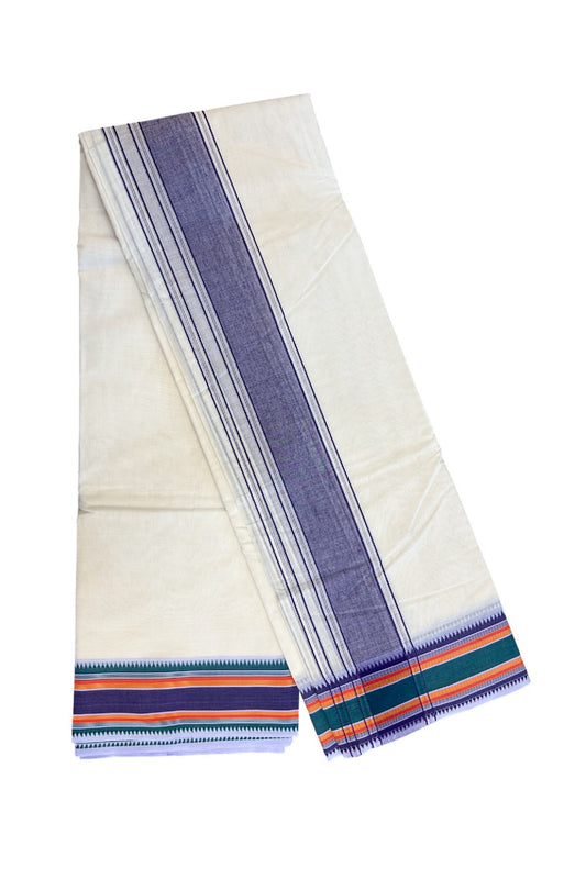Panchakacham Dhoti - 20% DISCOUNT! KaithariKada 100% Cotton Off White - (Unbleached) - Pure Cotton -100x100 thread - NORTH INDIAN - ATTACHED GAMCHA 9X5 Dhoti Violet kara with Violet Green & Orange Striped border - 2KK5196PMC