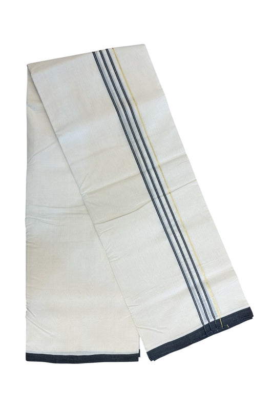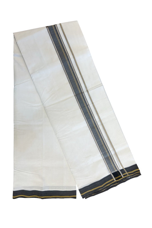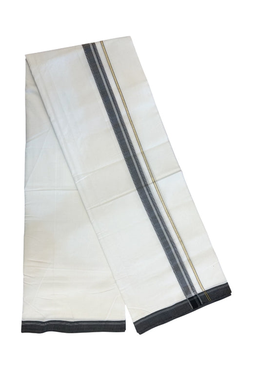 25% Discount! NEW ULTRA PURE WHITE HANDLOOM Balaramapuram - 100% Mercerised Cotton Double Mundu/Dhoti - 120(Twisted) x 80 - 1.5 inch Silver Kasavu Black shaded & Mustard Yellow stripes Kara - 38KK5167REA