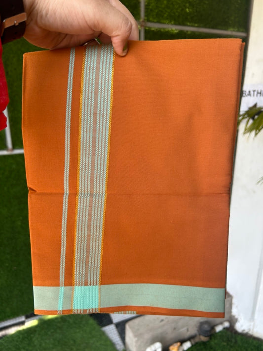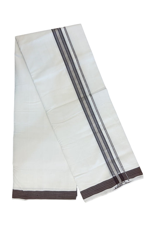 25% Discount! NEW ULTRA PURE WHITE HANDLOOM Balaramapuram - 100% Mercerised Cotton Double Mundu/Dhoti - 120(Twisted) x 80 - 1.25 inch Silver Kasavu Chocolate Brown shaded Sand brown striped Kara - 36KK5167REA