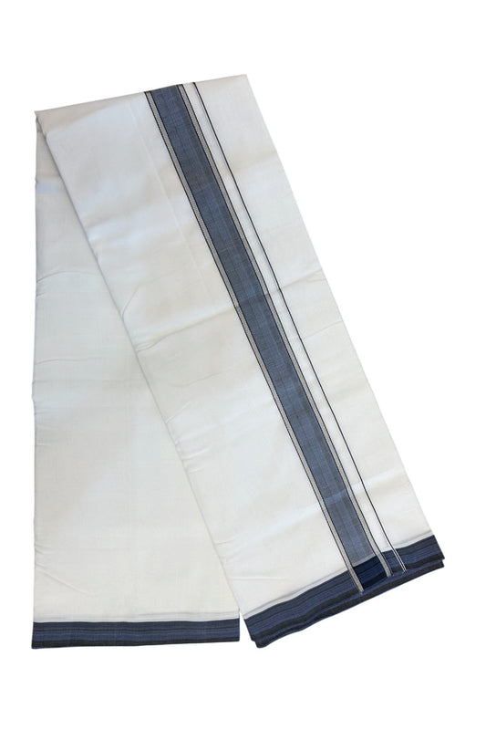 25% Discount! NEW ULTRA PURE WHITE HANDLOOM Balaramapuram - 100% Mercerised Cotton Double Mundu/Dhoti - 120(Twisted) x 80 - 1.75 inch Silver Kasavu Blue & Black shaded stripes Kara - 37KK5167REA