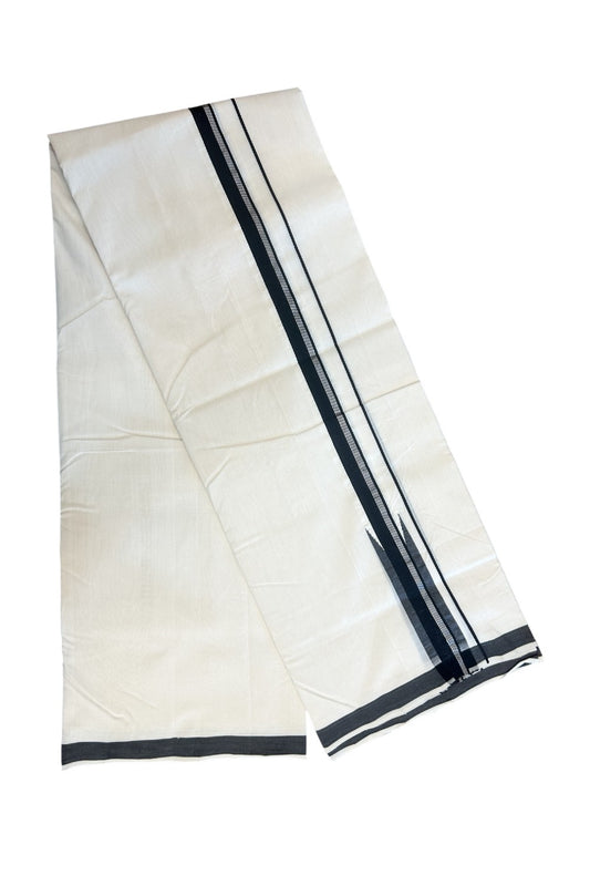 25% DISCOUNT!! KaithariKada HANDLOOM UNAKKUPAAV Balaramapuram - 100% PURE Cotton OFF White - (Unbleached) Double Mundu/Dothi - 120(Twisted) x 100 - 1.5 inch Silver kasavu stripes Black Puliyilakkara chutty 3.80 meter (8.5 Muzham) - 23KK5167REA