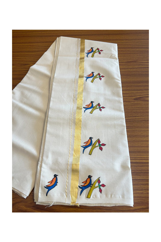 25% Discount!! KaithariKada HANDLOOM Millpaav Balaramapuram - 100% PURE Cotton OFF White - (Unbleached) Double Mundu/Dothi - 1.25 Inch Kasavu kara Hand Painted Bird Design - 2KK5091RAM