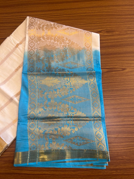 28% Discount! Kerala Colour Cotton Saree - Ash Blue Green with kasavu & white stripes - Kaitharikada - 12KK1009KK