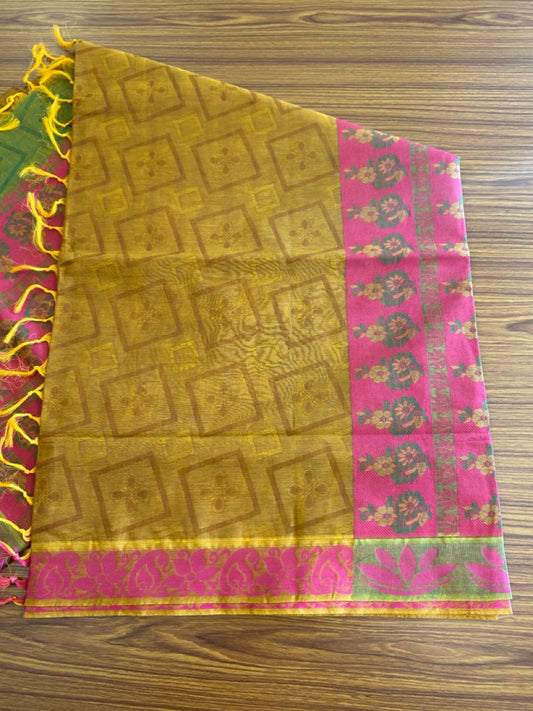 Kerala Colour Cotton Saree - Brownish Orange Green & Magenta Flower Design Kara - Kaitharikada - 10KK1007RJT