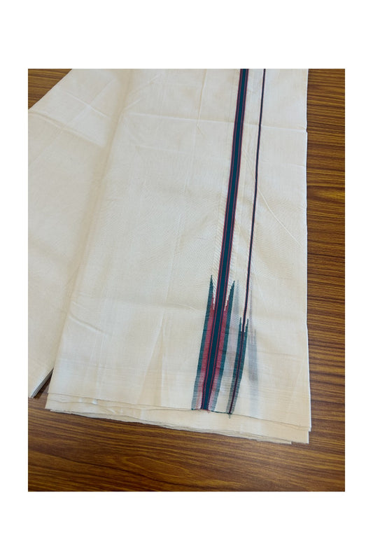 25% DISCOUNT!! KaithariKada HANDLOOM UNAKKUPAAV Balaramapuram - 100% PURE Cotton OFF White Double - (Unbleached) Mundu/Dothi - 1 inch Puliyilakkara Green & Red Stripes Double chutty - 7KK5049REA
