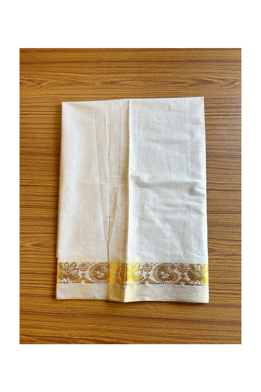Panchakacham Dhoti -15% DISCOUNT! KaithariKada Cotton Mix - PURE White - 80x80 thread- 80% Cotton & 20% Polyester- NORTH INDIAN ATTACHED GAMCHA 9X5 Dhoti- Gold KASAVU 2.5 inch & Border - 5KK5008PMC