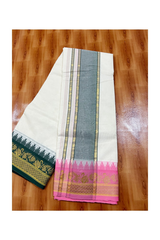 Panchakacham Dhoti - 37% DISCOUNT! KaithariKada - Cotton Mix - Off White - (Unbleached)- 80 x80 thread - 80% Cotton & 20% Polyester - NORTH INDIAN ATTACHED GAMCHA 9X5 Dhoti 5 inch Green kara with Pink & Green Kasavu Design border - 10KK5005PMC