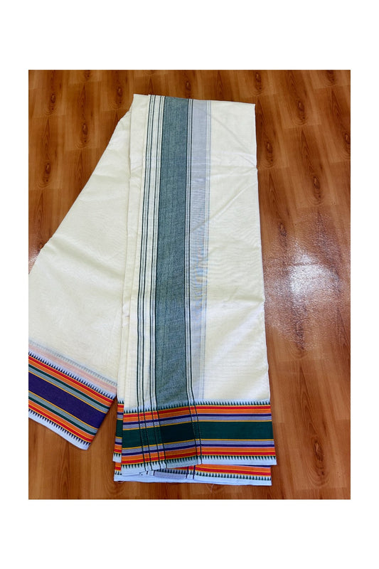 Panchakacham Dhoti -37% Discount! KaithariKada 100% Cotton Off White (Unbleached) Pure Cotton- 100x100 thread North Indain Attached Gamcha 10x6 Dhoti Green kara with Violet Green & Orange Striped border -12KK5004PMC