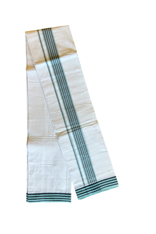 29% Discount! KaithariKada Balaramapuram 100% Cotton Pure White Double Mundu/Dhoti-100x100 2. inch Turqouise & Black Stripes Cotton kara 3.70m- 7KK493RAM