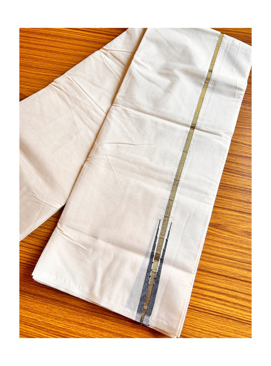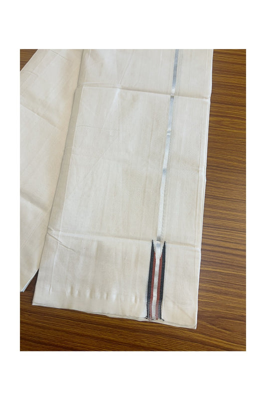 25% Discount! KaithariKada Balaramapuram Handloom Unakkupaav- 100% Pure Cotton 100x100 Double Mundu/Dhoti Off White (Unbleached) - Puliyilakkara Silver Kasavu & Black+Brick Red 2.cm Chutty Kara-29RAM