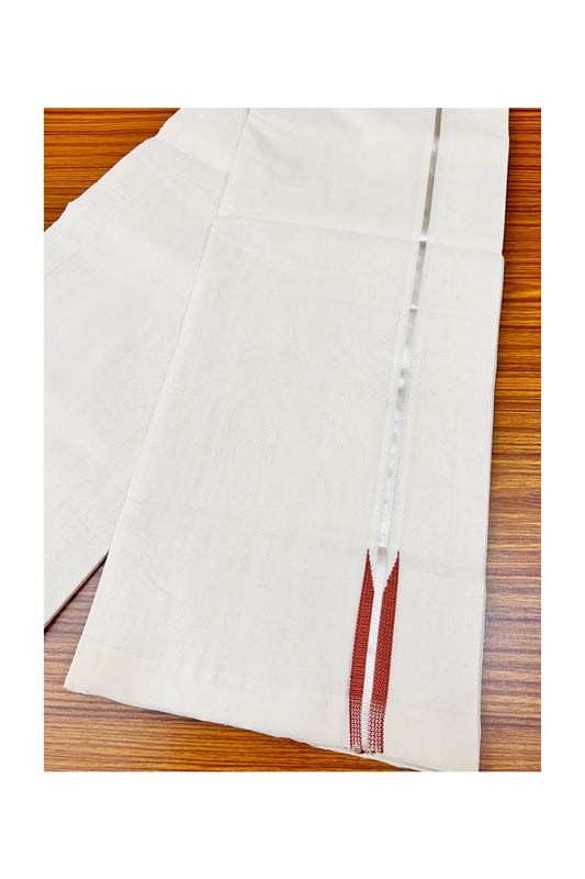 25% Discount! KaithariKada Balaramapuram Handloom Unakkupaav- 100% Pure Cotton 100x100 Double Mundu/Dhoti Off White (Unbleached) - Puliyilakkara Silver Kasavu & Brick Red Chutty Kara- 26RAM