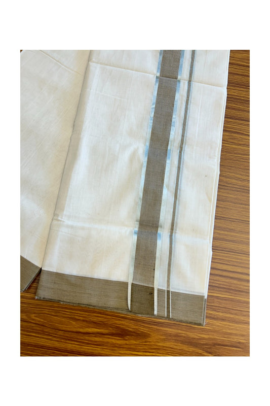 25% Discount KaithariKada Handloom Unakkupaav Balaramapuram - 100% Pure Cotton off white (Unbleached) Double Mundu/Dhoti - 2.5 inch Vine Brown & Silver Kasavu Kara-162