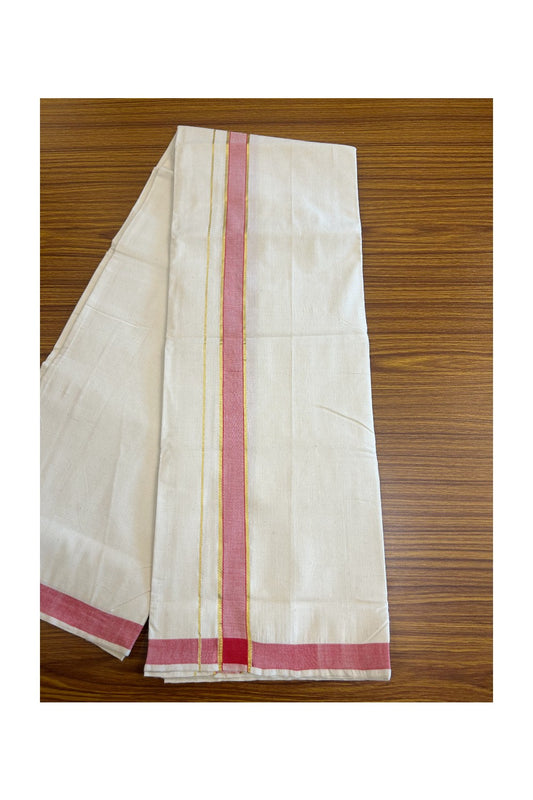 25% Discount! KaithariKada Handloom Millpaav Balaramapuram - 100% Pure Cotton off white (Unbleached) Double Mundu/Dhoti - 1.75 inch Kasavu & Red+Pink Kara-134