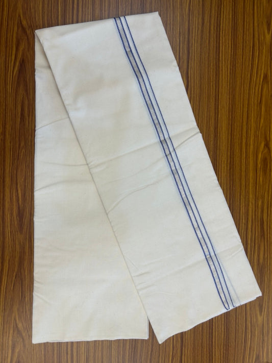 25% Discount!! Signature Kaitharikada Exclusive Single Dhoti - 100% Cotton Balaramapuram Handloom Single Mundu/Dhoti - Off White (Unbleached) 0.5 inch Silver Kasav & Blue Design Kara (2 meter / 4 muzham) - 1 KK5293 KAI