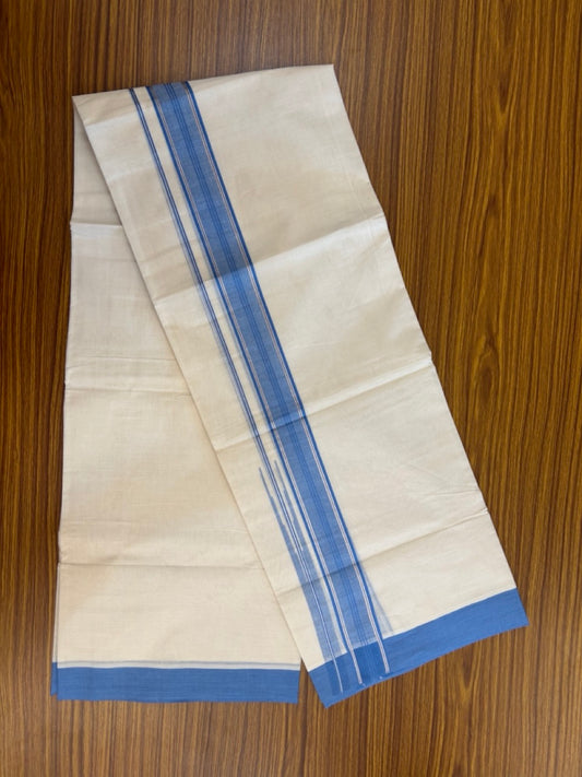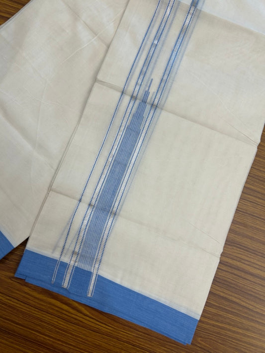 20% Discount! KaithariKada Balaramapuram 100% Cotton Double off white (Unbleached) Mundu/Dhoti - 100X80 - 1.5 inch Silver kasavu & Sky blue shaded striped chutty - 4 mtr (8.5 Muzham) - 37 KK5283 PMC