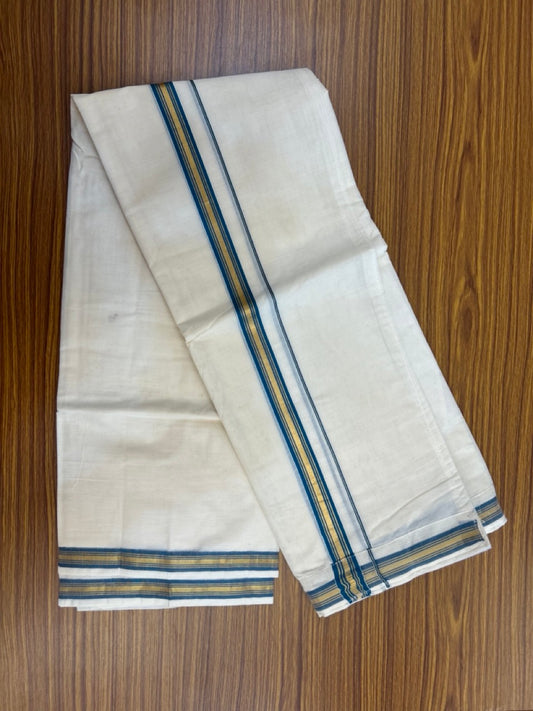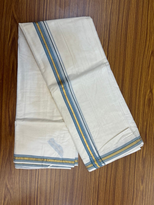 20% Discount ! KaithariKada Balaramapuram Mixed Cotton Double Off white - (Ubleached) Mundu/Dhoti VELCRO Mundu/Dhoti - (80s) - 1 inch Gold Kasavu & Peacock Blue Striped kara 4mtr (8.5 muzham) - 3 KK5284 PMC