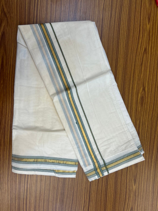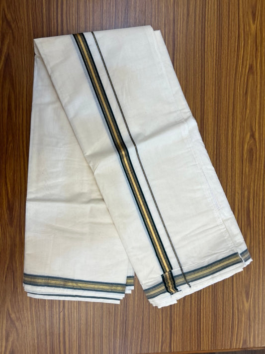 20% Discount ! KaithariKada Balaramapuram Mixed Cotton Double Off white - (Ubleached) Mundu/Dhoti VELCRO Mundu/Dhoti - (80s) - 1 inch Gold Kasavu & Dark Green Striped kara 4mtr (8.5 muzham) - 4 KK5284 PMC