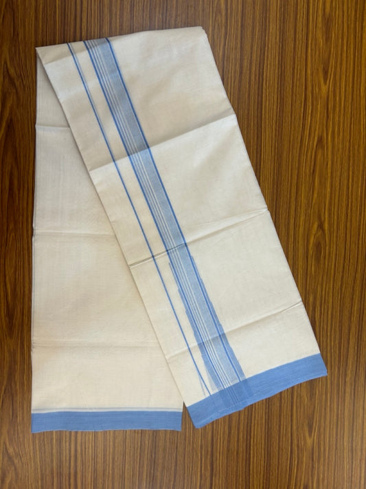 20% Discount! KaithariKada Balaramapuram 100% Cotton Double off white (Unbleached) Mundu/Dhoti - 100X80 - 1.5 inch Silver kasavu & Sky blue shaded striped chutty - 4 mtr (8.5 Muzham) - 37 KK5283 PMC